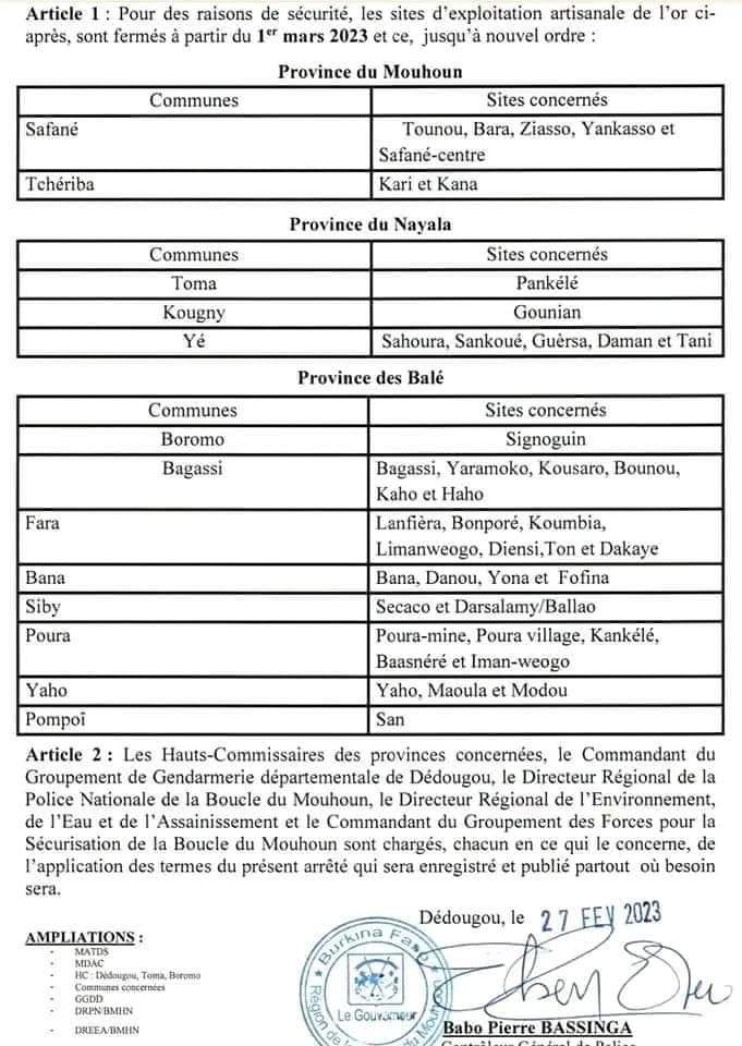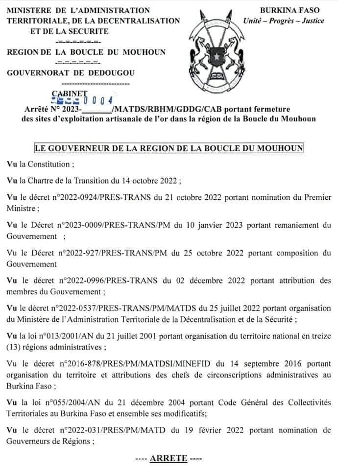 Dans un arrêté, le Gouverneur de la Boucle du Mouhoun ordonne la fermeture des sites d’orpaillage sur certaines localités de son ressort territorial à partir du 1er Mars, jusqu’à nouvel ordre.