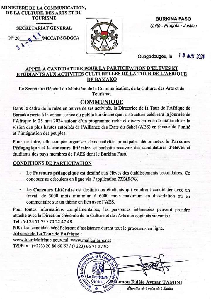 Pour ce faire, elle compte organiser deux activités principales dénommées le Parcours Pédagogique et le concours littéraire, et souhaite recevoir des candidatures d’élèves et étudiants des pays membres de l’AES dont le Burkina Faso.