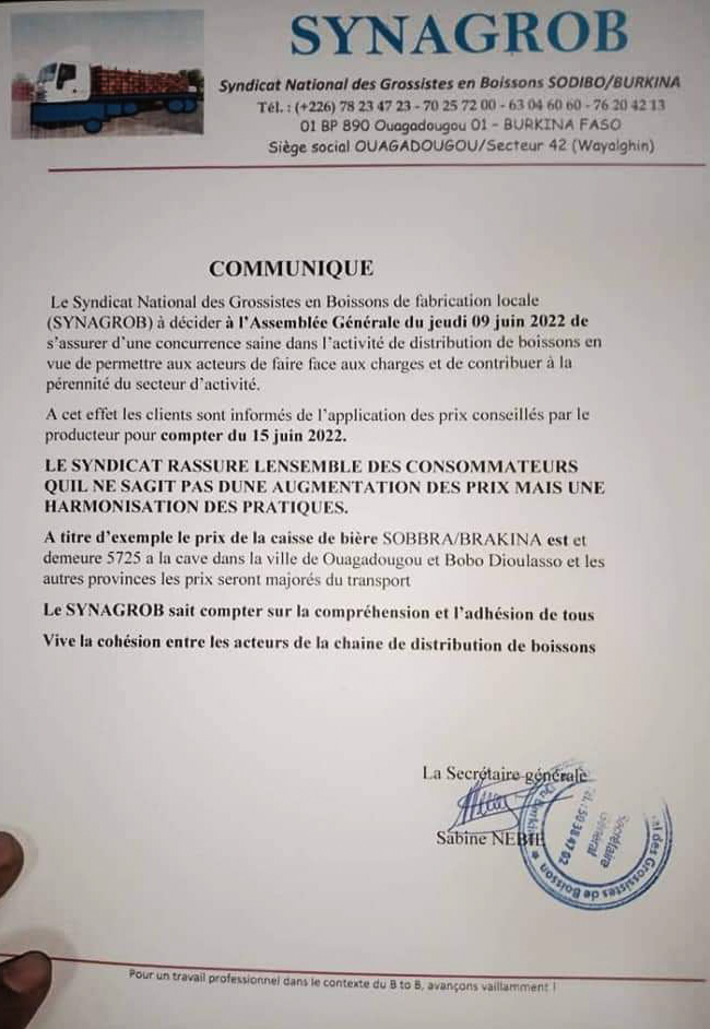 Le Syndicat National des Grossistes en Boissons SODIBO/BURKINA a annoncé dans un communiqué, un réajustement des tarifs des boissons à compter du 15 juin 2022.