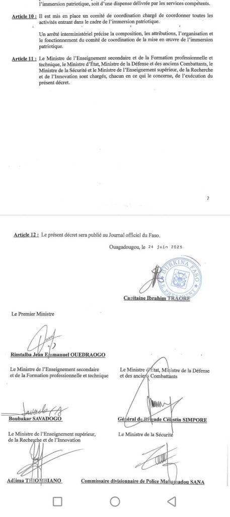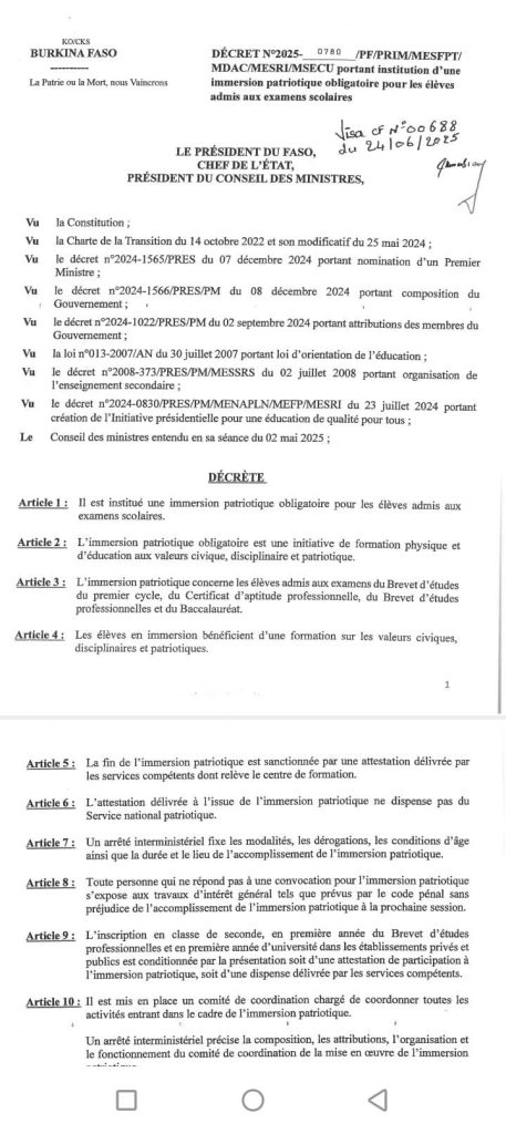 Adopté en Conseil des ministres le 2 mai 2025 et signé par le Capitaine Ibrahim Traoré, le décret n°2025-0780 instaure une formation civique, disciplinaire et patriotique pour tous les élèves reçus aux examens scolaires, du BEPC au Baccalauréat. Cette immersion, sanctionnée par une attestation, conditionnera l’inscription aux cycles supérieurs dans les établissements publics et privés.