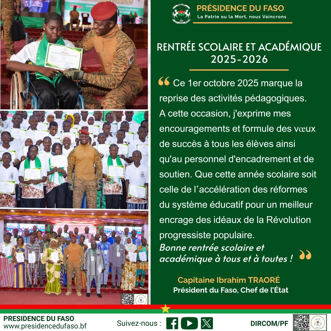 À l’occasion de la rentrée scolaire et académique 2025-2026, Son Excellence le Capitaine Ibrahim TRAORÉ, Président du Faso, Chef de l’État a, dans un message publié sur son compte X et dont la teneur suit, encouragé les différents acteurs dans la quête permanente de l’excellence au service du Peuple :