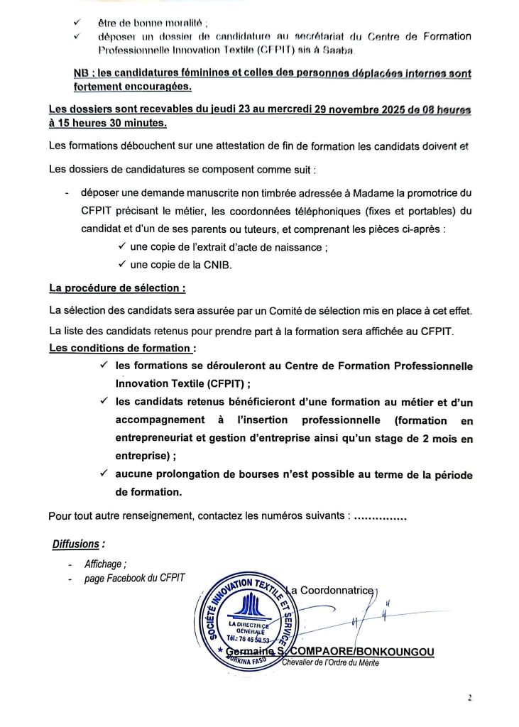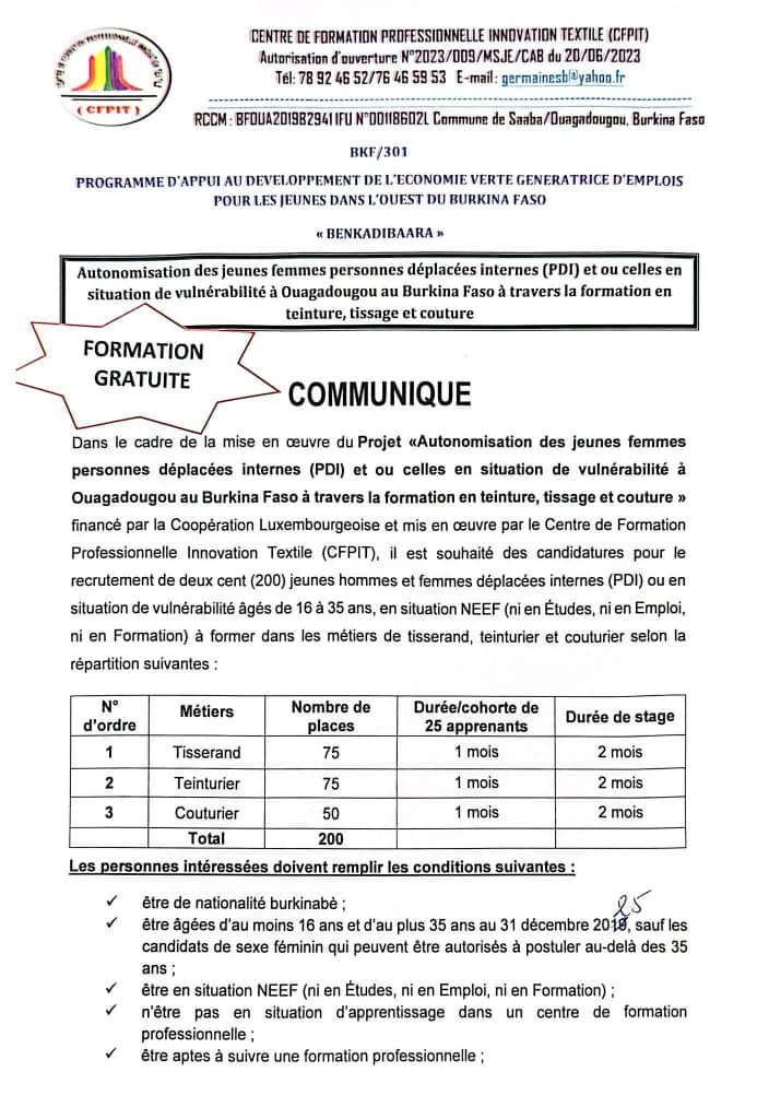 Dans le cadre de la mise en œuvre du projet » Autonomisation des jeunes garcons et femmes personnes déplacées internes (PDI) et ceux ou celles en situation de vulnérabilité à Ouagadougou au Burkina Faso à travers la formation en teinture, tissage et couture » financé par la coopération Luxembourgeoise et mis en œuvre par le Centre de Formation Professionnelle Innovation Textile (CFPIT), souhaite recevoir des candidatures pour le recrutement de deux cent (200) jeunes hommes et femmes PDI ou en situation de vulnérabilité âgés de 16 à 35 ans .