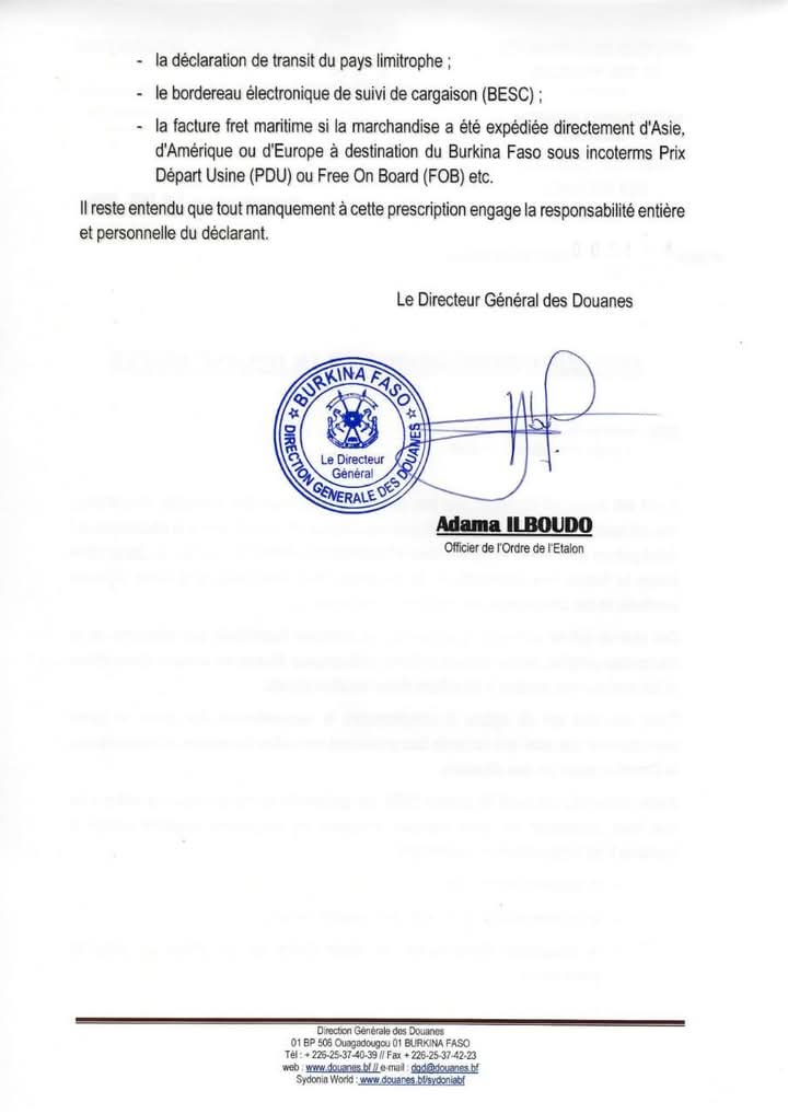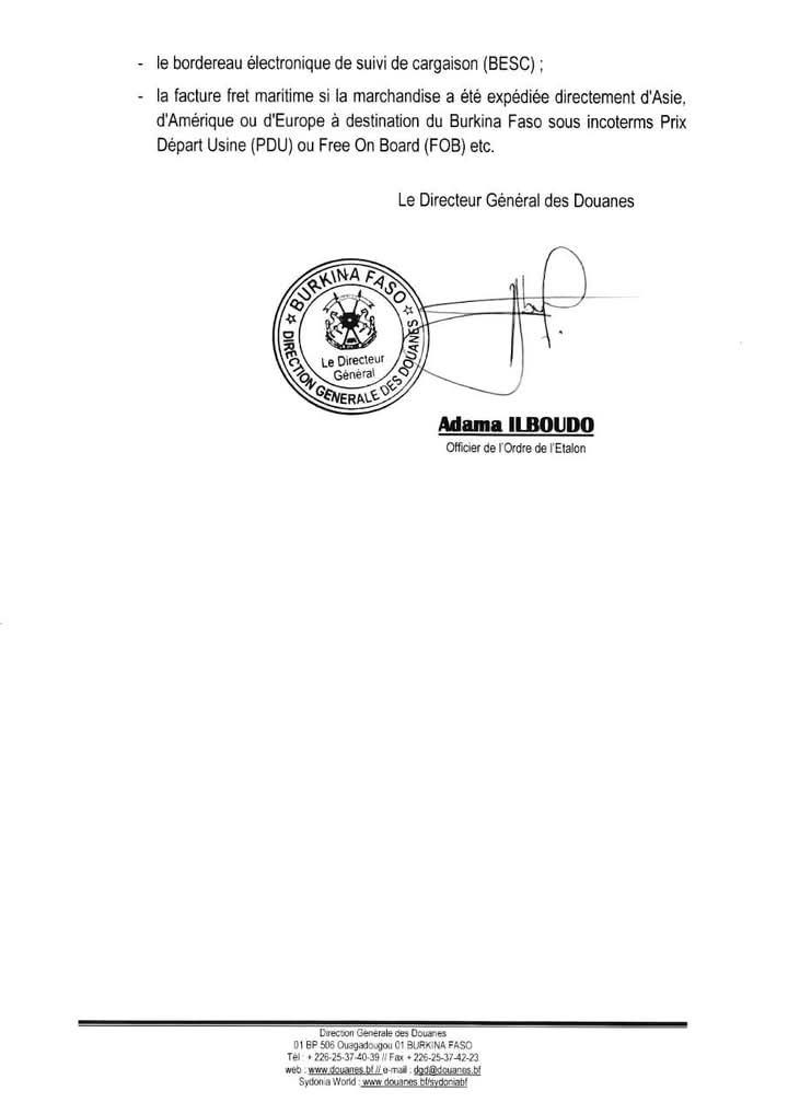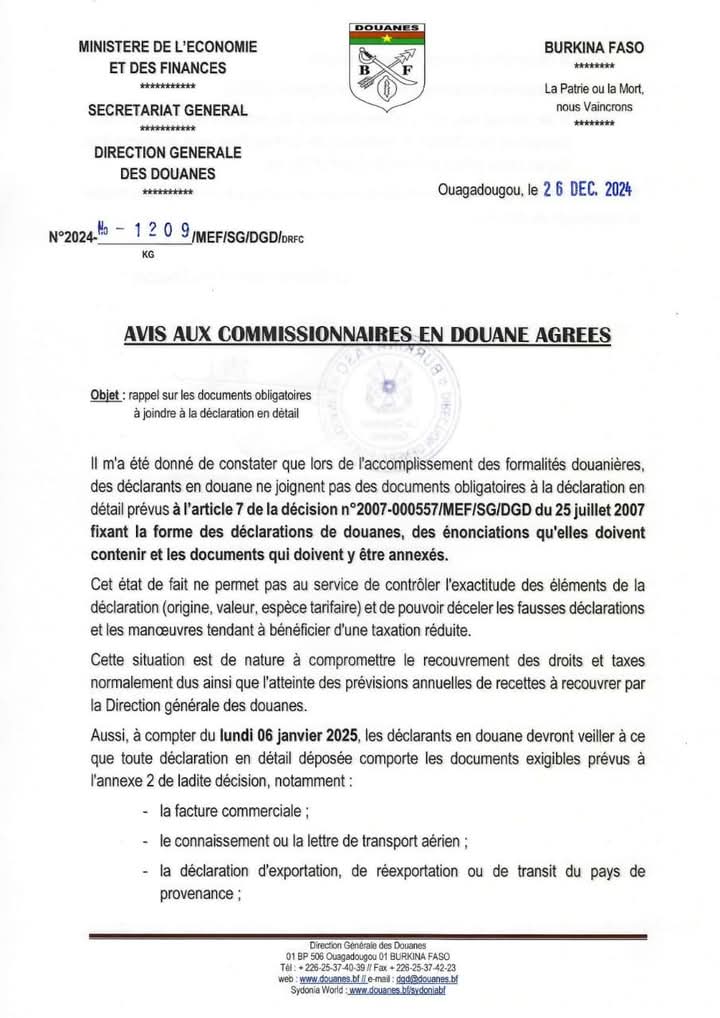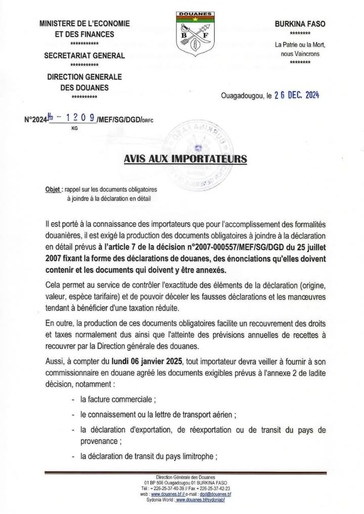 Dans un communiqué en date du 26 décembre 2024, le directeur général des douanes, Adama Ilboudo, rappelle aux importateurs, la nécessité de joindre des documents obligatoires à la déclaration en détail.