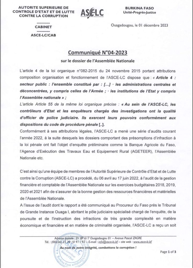 Ceci est un communiqué de l’Autorité Supérieure de Contrôle d’Etat et de Lutte contre la Corruption (ASCE-LC) sur l’audit de l’Assemblée Nationale.