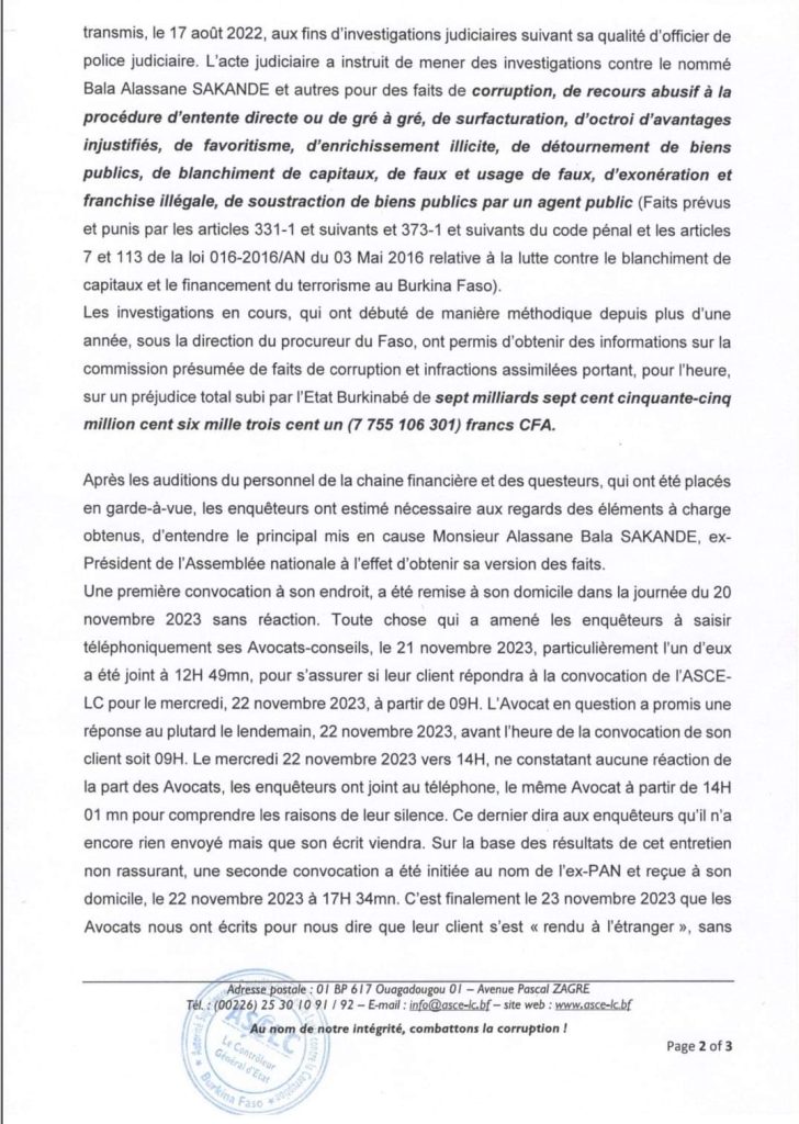 Au regard des éléments à charge obtenus, les enquêteurs ont estimé nécessaire d’entendre le principal mis en cause, Monsieur Alassane Bala SAKANDE, ex Président de l’Assemblée nationale, à l’effet d’obtenir sa version des faits, qui a malheureusement répondu absent à nos deux (2) convocations pour son audition. En attendant la présentation physique effective du mis en cause, il existe des raisons objectives de penser à une velléité de soustraction à la procédure.
