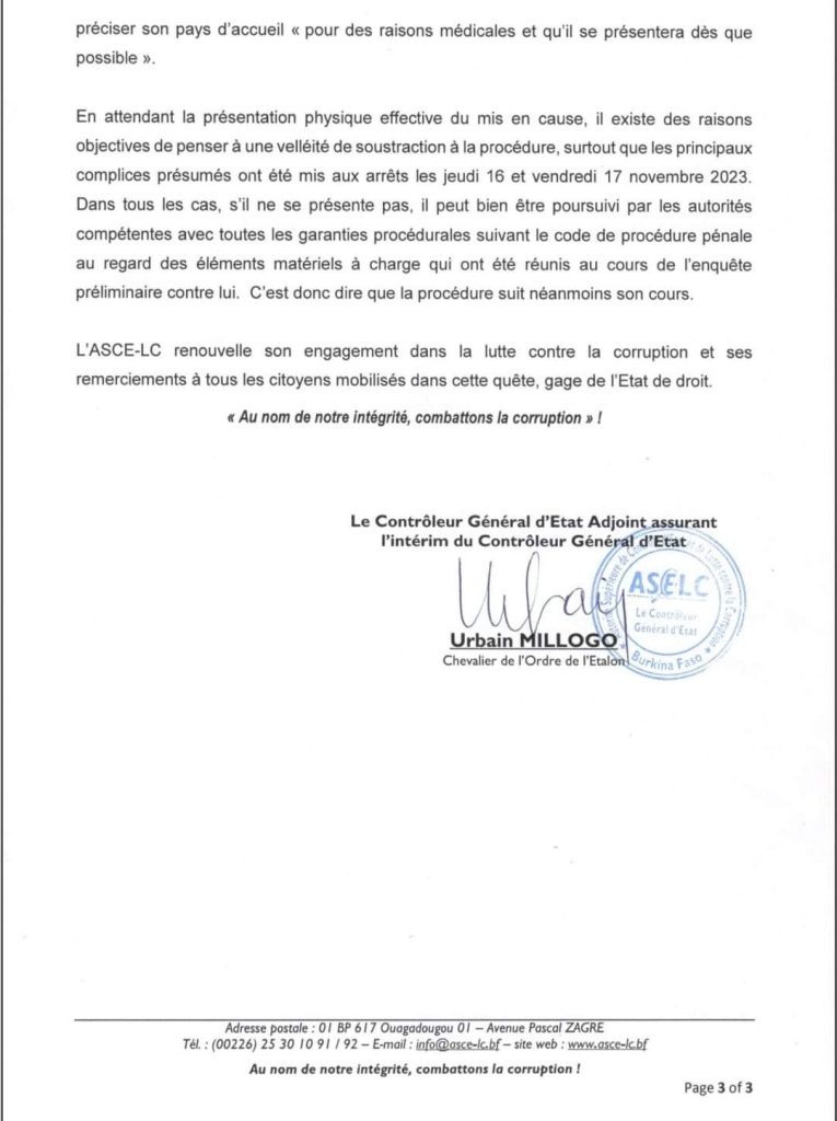 La lutte contre la corruption demeure notre priorité et aucune tentative de l’ignorer ou de ne pas le considérer comme telle, ne saurait ébranler notre détermination à faire prévaloir la justice. L’ASCE-LC renouvelle son engagement dans la lutte contre la corruption et ses remerciements à tous les citoyens mobilisés dans cette quête, gage de l’Etat de droit. Nous nous ferons le devoir de vous informer de tout développement ultérieur dans cette affaire qui suit toujours son cours.