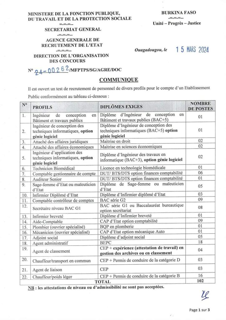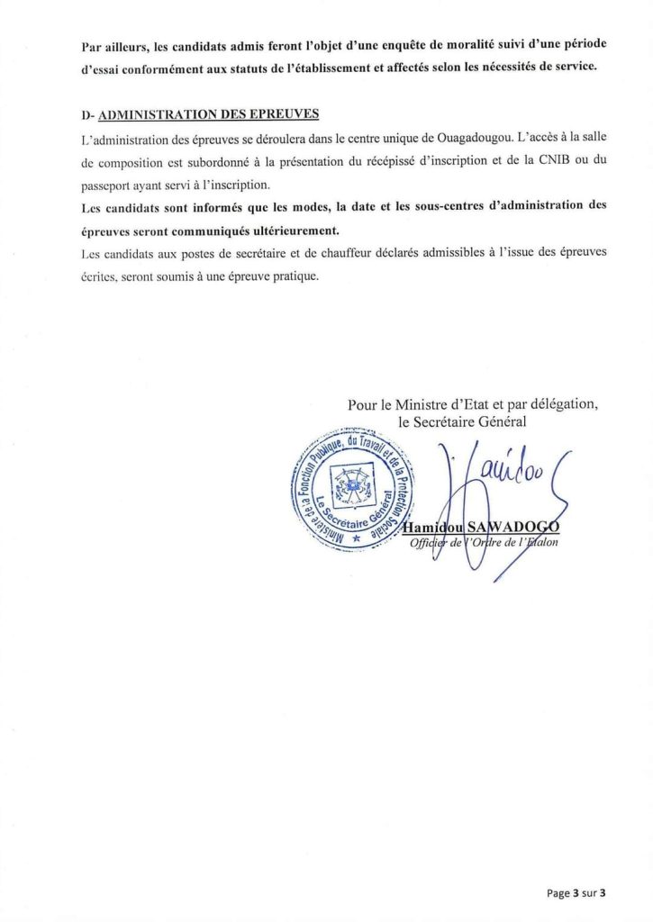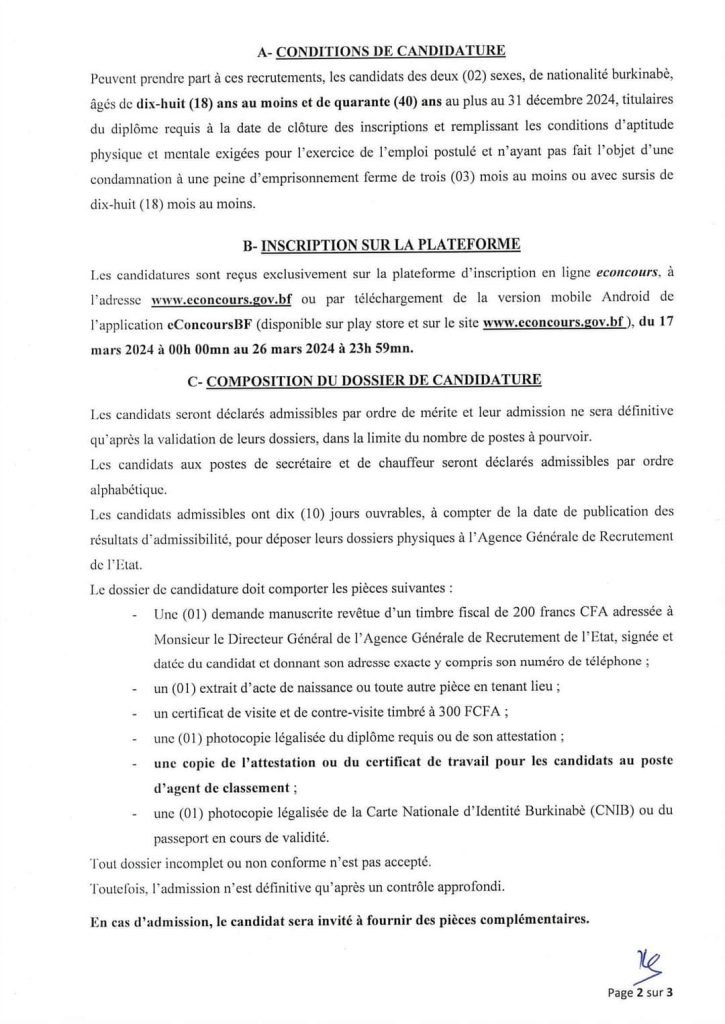 Les inscriptions se feront en ligne sur la plateforme e-concours, accessible à l’adresse www.econcours.gov.bf, du 17 mars 2024 à 00 h au 26 mars 2024 à 23 h 59 mn.