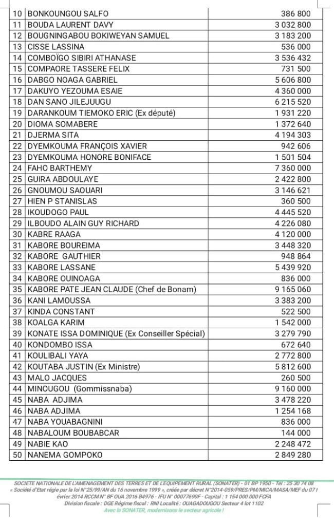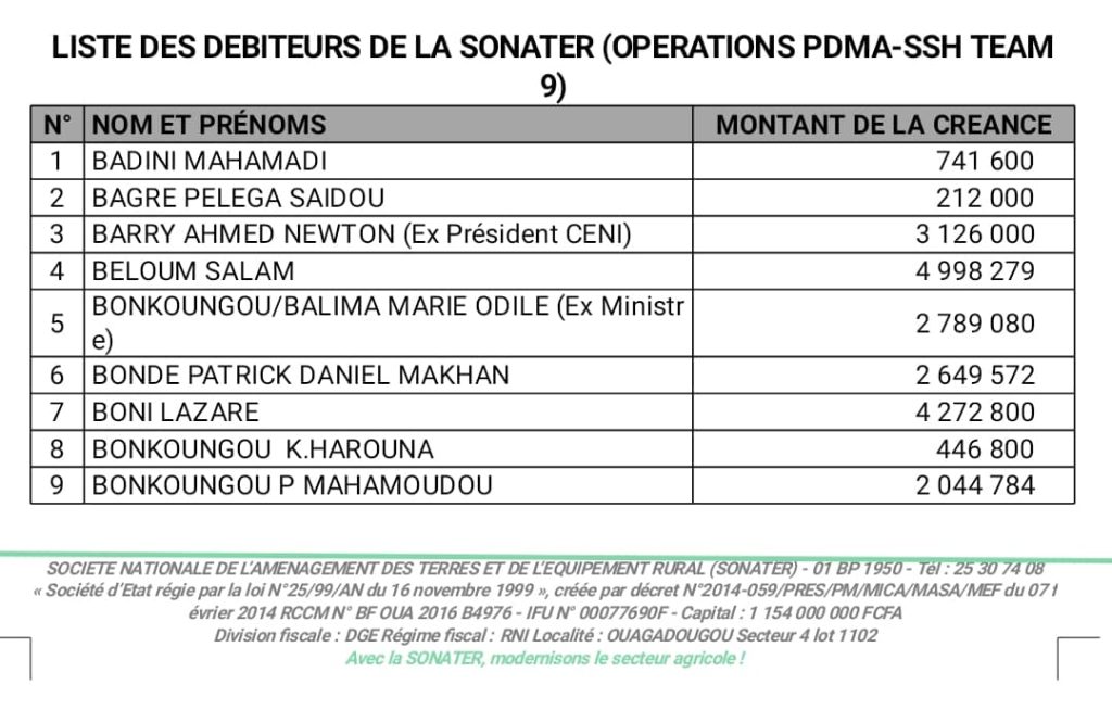 Le Directeur Général de la Société Nationale de l’Aménagement des Terres et de l’Equipement Rural (SONATER) invite les personnes ayant bénéficié des équipements agricoles à crédit du Projet de Développement de la Mécanisation Agricole et de Soutien au Secteur Hydraulique (PDMA-SSH TEAM 9) en 2008 – 2012 et dont la date d’échéance de règlement est échue depuis l’année 2014 à s’acquitter de leurs créances. La SONATER donne trente (30) jours aux personnes concernées pour solder leurs créances ; passé ce délai, les différentes procédures judiciaires en la matière seront enclenchées pour le recouvrement de ces créances.
