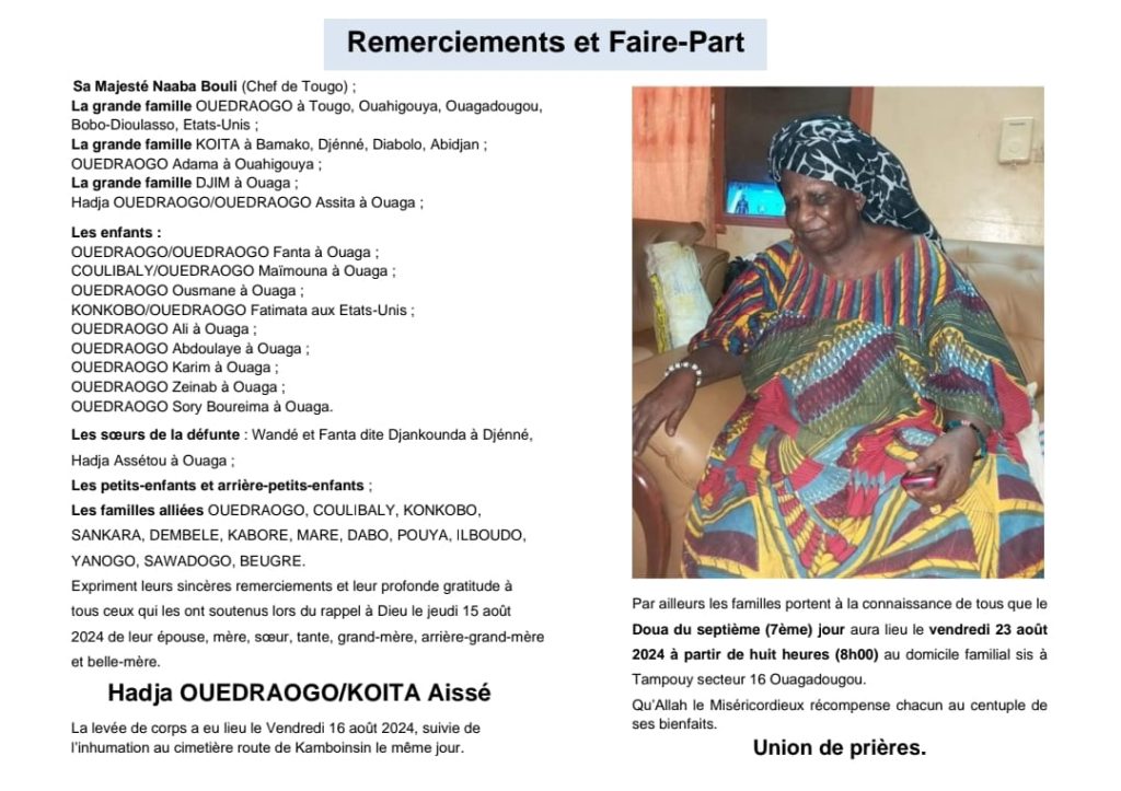 Décès de Hadja OUEDRAOGO/KOITA Aissé : Remerciements et faire-part