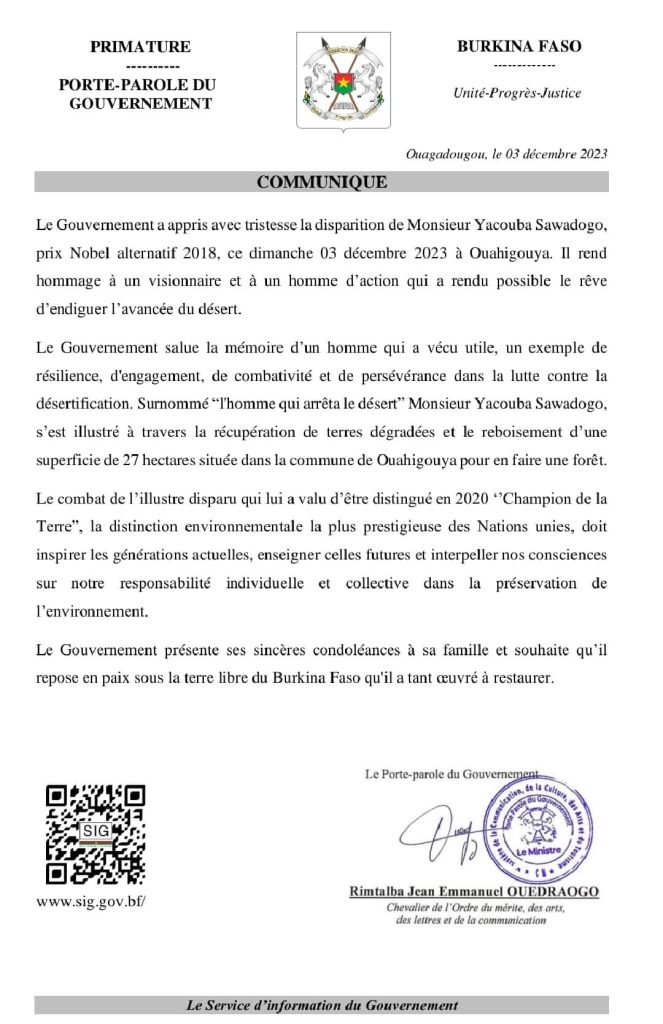 Dans le communiqué de presse ci-après, le Gouvernement burkinabè rend hommage à Yacouba Sawadogo, Prix nobel alternatif décédé ce 03 décembre 2023.