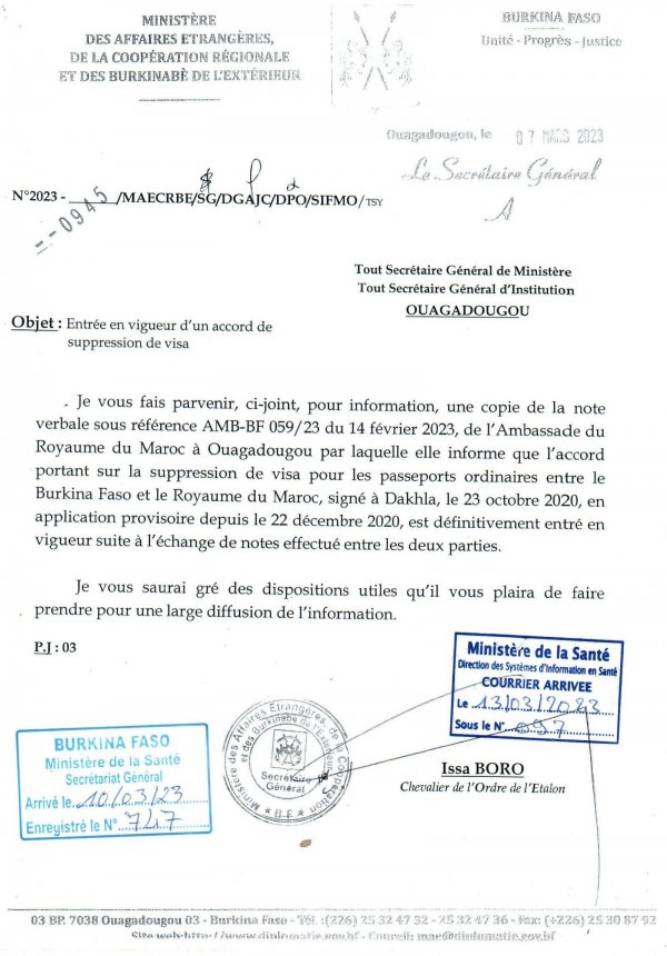 Dans une note de ce mardi 14 mars 2023, le ministère des Affaires étrangères, de la Coopération régionale et des Burkinabè de l’extérieur informe de l’entrée en vigueur de la suppression du visa pour les passeports ordinaires entre le Burkina Faso et la République du Maroc.