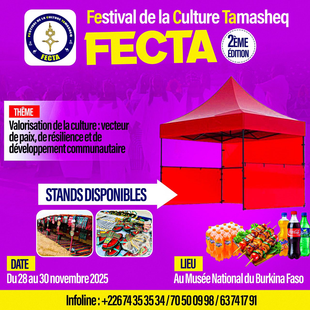 À l’occasion de la 2ème édition du Festival de la Culture Tamasheq (FECTA), nous offrons aux artisans, entrepreneurs et promoteurs l’opportunité unique d’exposer leurs produits et services dans un cadre prestigieux au Musée National du Burkina Faso.