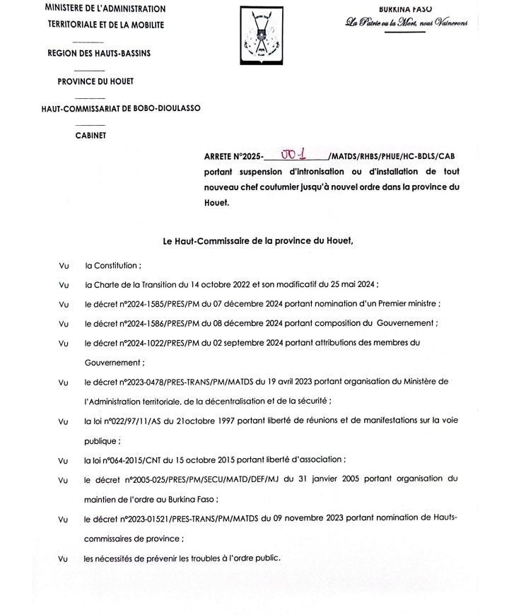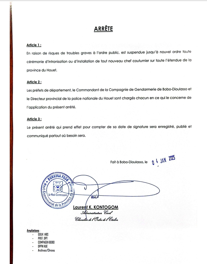 Dans un arrêté en date du 04 janvier 2025, le Haut-commissaire du Houet, Laurent K. Kontogom, a suspendu jusqu’à nouvel ordre, l’intronisation ou l’installation de tout nouveau chef coutumier dans son ressort territorial. Sa décision est motivée par « des risques de troubles graves à l’ordre public ». Voici l’arrêté ci-dessous :