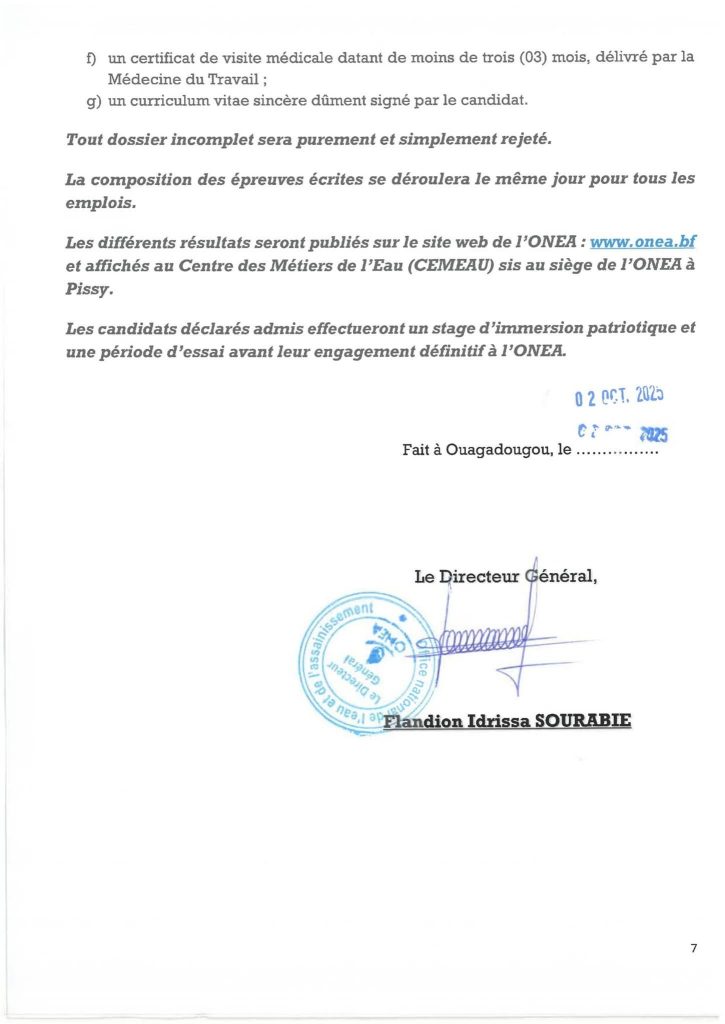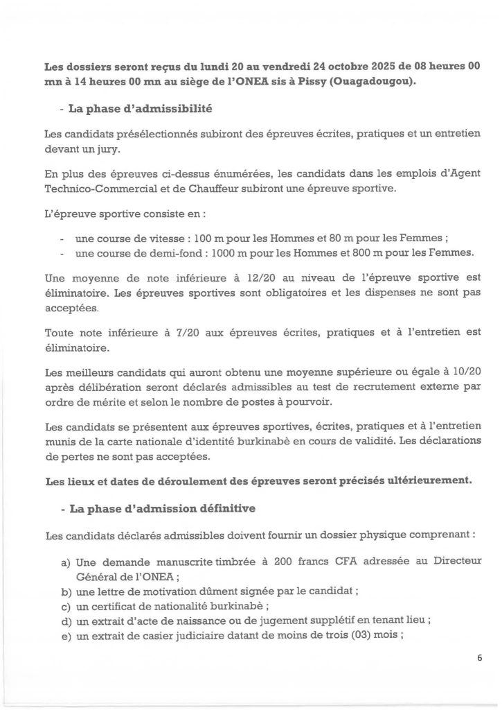 L’Office National de l’Eau et de l’Assainissement (ONEA) annonce l’ouverture d’un test de recrutement externe pour emploi direct, session 2025. Le concours, qui se déroulera à Ouagadougou, vise à renforcer ses effectifs par l’intégration de nouveaux profils dans plusieurs corps de métiers.