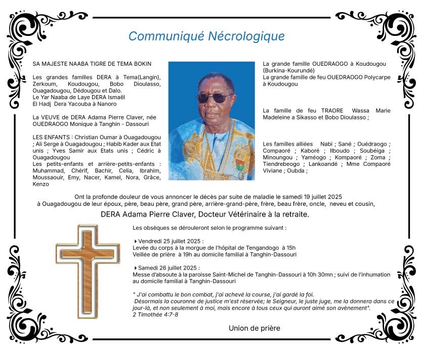 Nécrologie : DERA Adama Pierre Claver, Docteur Vétérinaire à la retraite, rappelé à Dieu le 19 juillet 2025