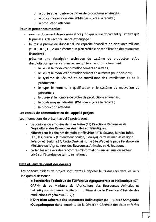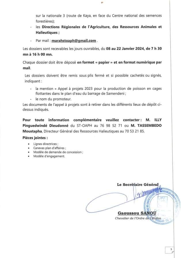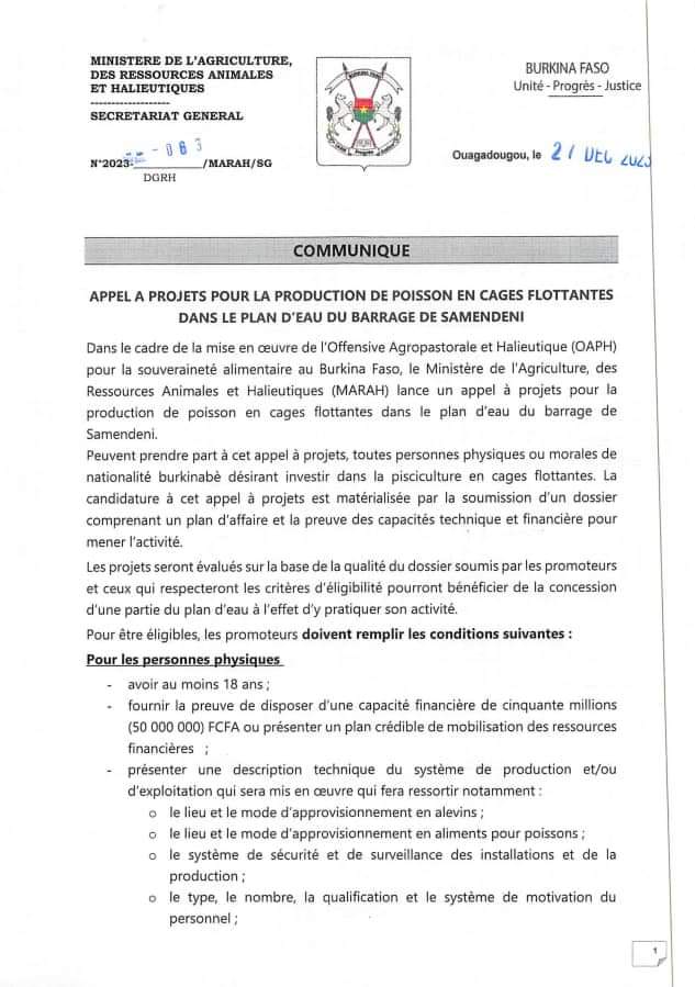 Ceci est un communiqué du ministère de l’agriculture, des ressources animales et halieutiques sur un avis d’appel à projet pour la production de poisson en cage flottantes dans le plan d’eau du barrage de Samendeni.