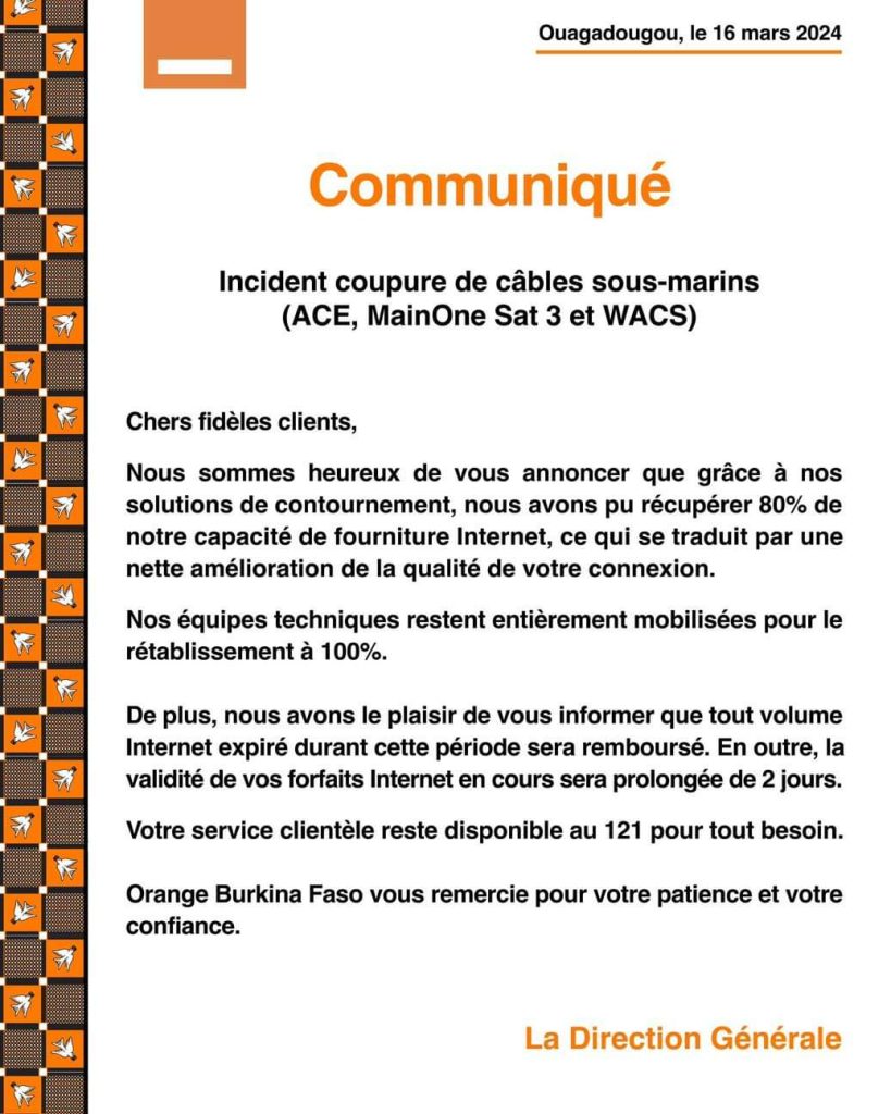 Perturbation d’internet : Orange Burkina annonce qu’il a récupéré 80% de sa capacité de fourniture Internet