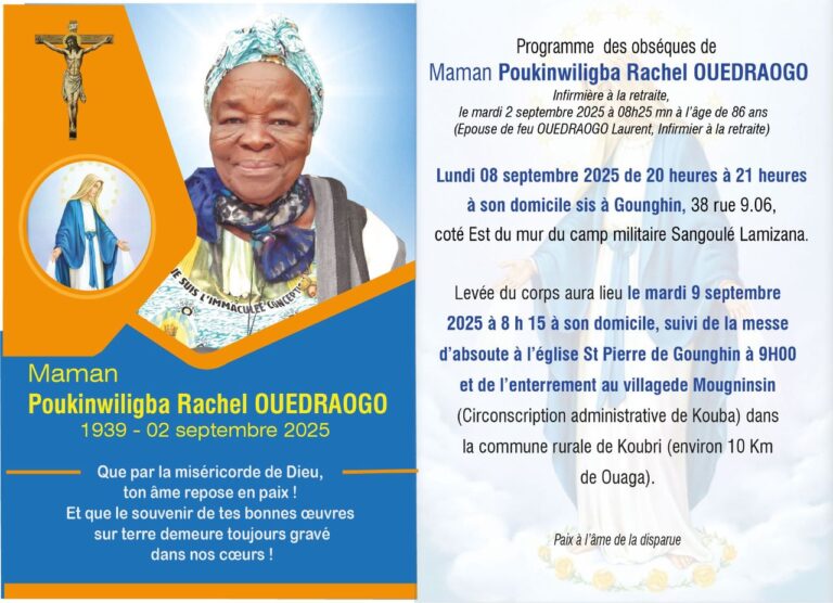 Ses obsèques auront lieu les 08 et 09 septembre 2025 au quartier Gounghin, suivies de l’inhumation au village de Mougninsin, dans la commune rurale de Koubri.