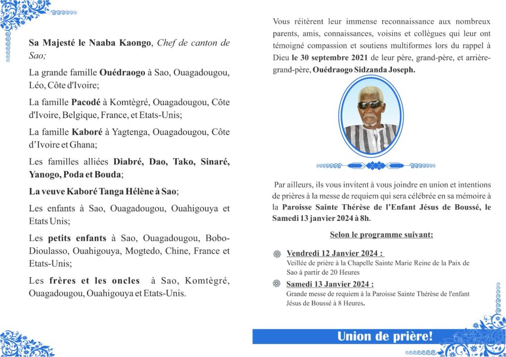 Rappel à Dieu de Sidzanda Joseph Ouédraogo : messe de requiem le samedi 13 janvier 2024 à Boussé