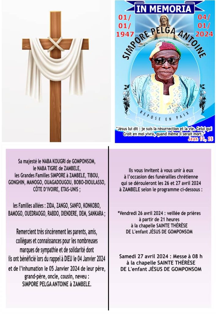 Rappel à Dieu de Simporé Pelga Antoine : messe de requiem le 27 avril 2024 à Gomponsom