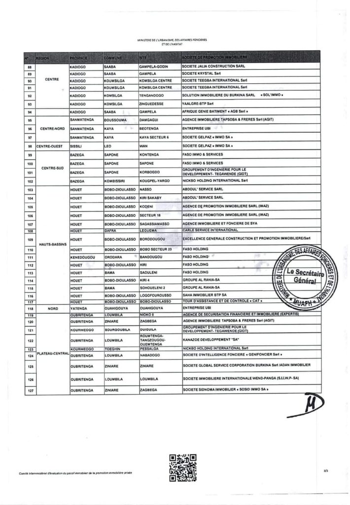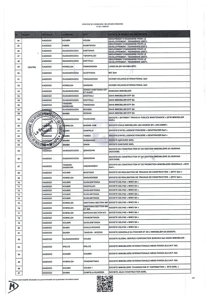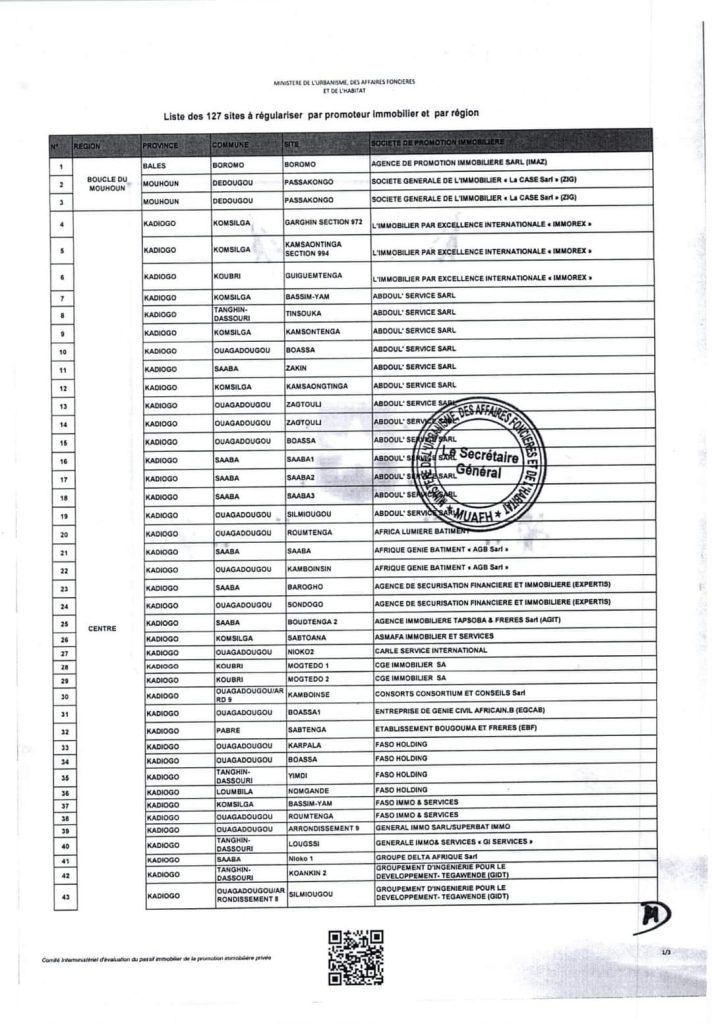 La première phase de régularisation concernera 127 sites de 49 promoteurs immobiliers préalablement identifiés répartis dans 09 régions que sont le Centre, les Hauts-Bassins, la Boucle du Mouhoun, le Centre-Est, le Centre-Nord, le Centre- Ouest, le Centre-Sud, le Nord et le Plateau-Central.