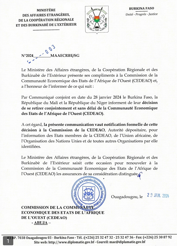 Ceci est la notification formelle du Burkina Faso à la CEDEAO, suite à sa décision conjointe avec le Mali et le Niger de se retirer sans délai de la CEDEAO.
