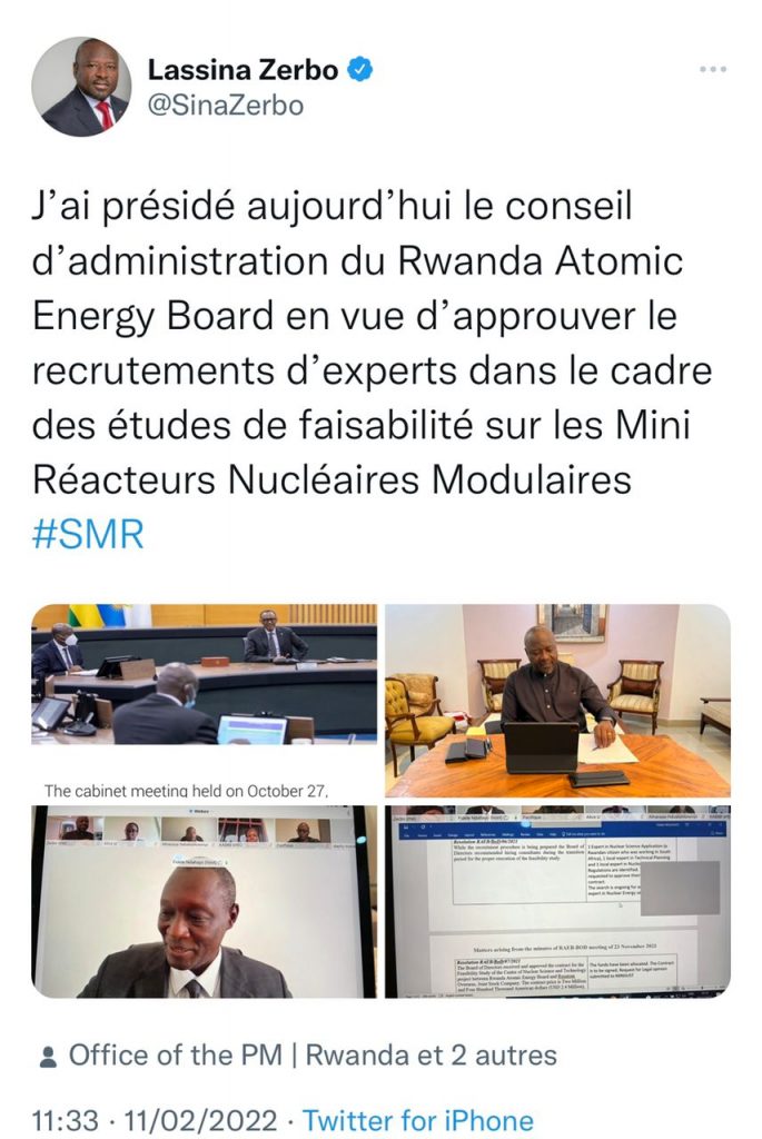 Dans un tweet publié ce vendredi 11 février, Lassina Zerbo a dit avoir présidé à Kigali, le Conseil d’administration du Rwanda Atomic Energy Bord. Ce, dans l’optique de recruter des experts dans le cadre des études de faisabilité sur les mini réacteurs nuccléaires modulaires.