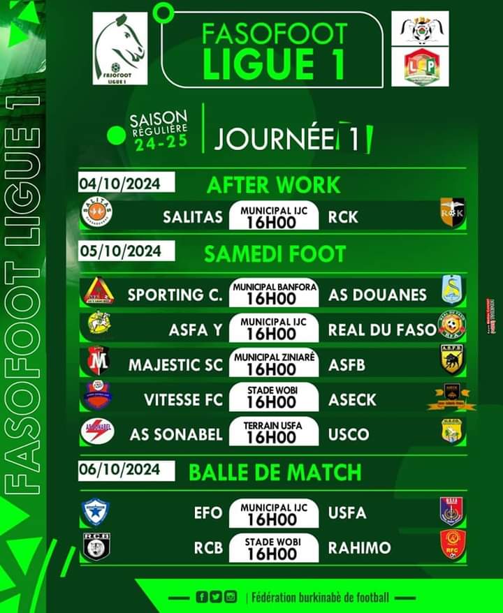 La saison 2024-2025 du Fasofoot Ligue 1 démarre ce vendredi 4 octobre 2024, avec une affiche alléchante : le derby ouagalais entre SALITAS et le Rail Club du Kadiogo (RCK). Ce match, programmé en afterwork à 16H 00 au stade municipal Issoufou Joseph Conombo, est une opposition de style.